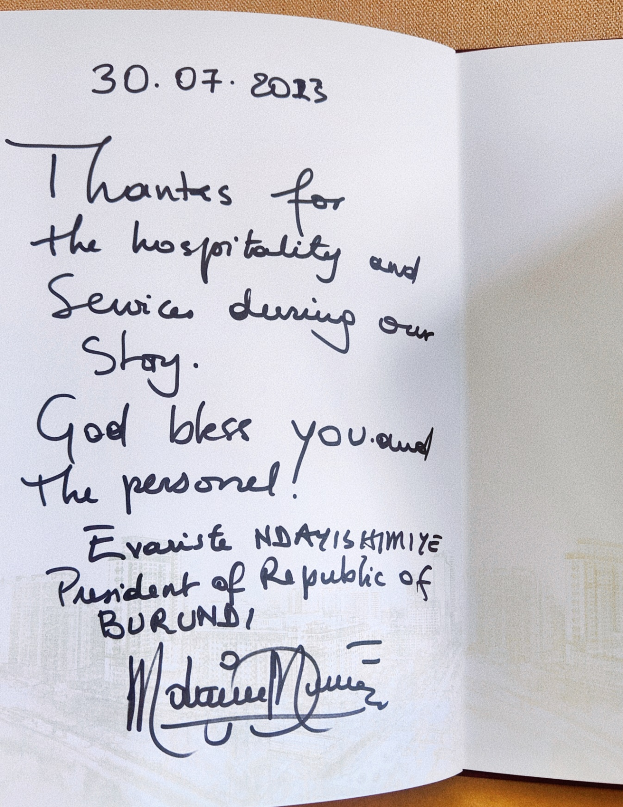 国家向导人及夫人离馆之际,在金牛宾馆亲热问候了宾馆以党科同志为代表的服务包管团队成员,表达了对川菜的喜欢,夸赞川菜“巴适”,并体现在金牛宾馆可以享用到正宗的川菜,赞美金牛宾馆是有古板的宾馆。布隆迪总统恩达伊施米耶在锦江宾馆留言簿上留言,体现了对锦江宾馆此次接待的谢谢,并与接待职员合影留念。